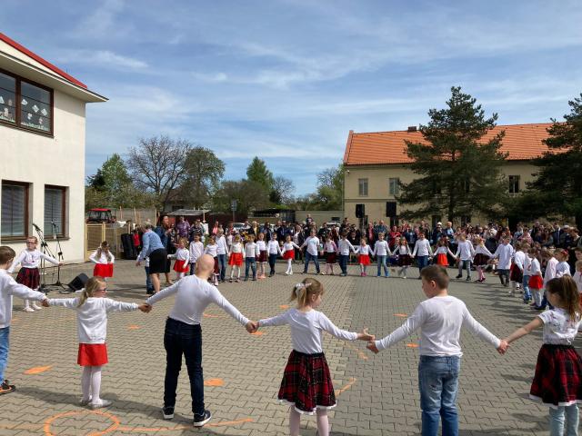 Děti ze školní družiny vystoupily dne 1.5. na akci k oslavám 1. máje. Nejdříve zatančily děti ze 3.oddělení za doprovodu dětského orchestru pod vedením K.Červeného. K tanci využily stuhy, děvčata se ukázala jako mažoretky a pak společně s chlapci si zatančili v rytmu polky.